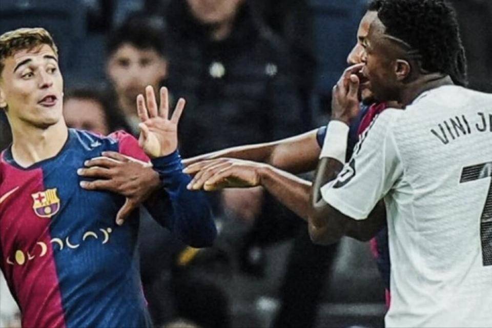 金球奖颁奖典礼前的西班牙国家德比,“玉面小屠夫”加维在拉菲尼亚进球后伸出4个手指贴对着维尼修斯贴脸开大,从来不会当面隐忍的“熊皇”维尼修斯也没惯着,对着哈维说出了那句时候让他成为笑柄的话——我马上就要去领金球奖了,你有什么?